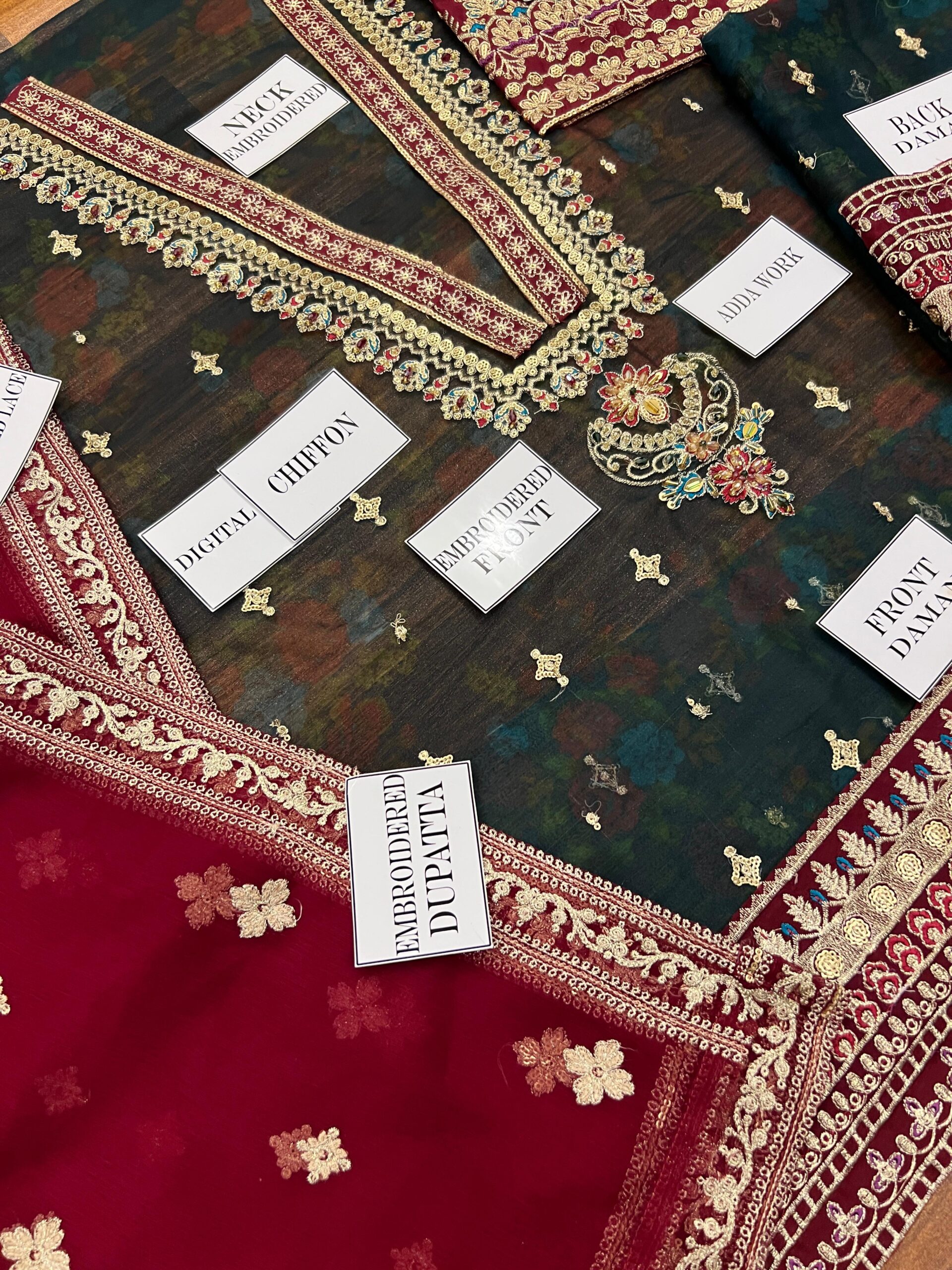 Dupatta: Chiffon fully sequence embroidered with a 4-side embroidered border, ready to wear with no appliqué work required, crafted exactly like the original design